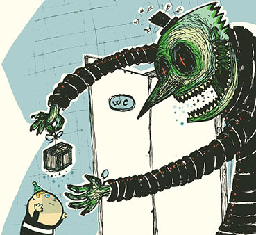 La puerta del servicio surgió como una aparición fantasmal al final de un pasillo de paredes blancas, desconchadas en distintos lugares y mancilladas con breves mensajes de diversa índole, la mayoría de ellos de carácter obsceno o racista. La puerta exhibía un pequeño cartel con un joven sonriente sobre un fondo multicolor. Alex tomó el pomo entre sus manos y la entornó.